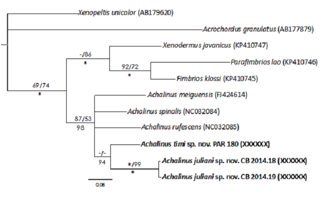 Dựa trên phân tích các đặc điểm hình thái và sinh học phân tử, các loài mới này này có khoảng cách di truyền lớn hơn 12,7% trên gen COI, so với tất cả các loài thuộc giống Achalinus hiện biết tại Việt Nam. Hơn nữa, các mẫu vật của 3 loài mới thu thập được cũng phân chia thành ba nhóm riêng biệt.