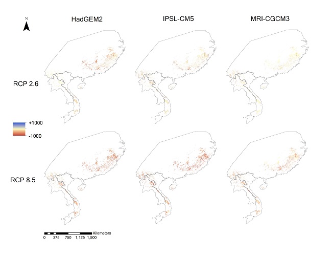 Hình 2. Dự đoán sự thay đổi của sự phù hợp với môi trường sống với các kịch bản biến đổi khí hậu khác nhau bởi các mô hình GCM khác nhau vào năm 2070. Màu xanh lam cho thấy sự phù hợp với môi trường sống trong khi màu đỏ cho thấy sự phù hợp với môi trường sống giảm.