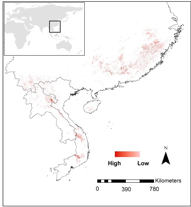 Hình 3. Độ che phủ rừng bị mất từ năm 2000 đến 2015 trong phân bố hiện tại dự đoán của loài T. aureus. Màu đỏ đậm hơn cho thấy cường độ mất rừng cao hơn.