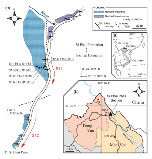 Hình 1. Vị trí địa lý và bối cảnh địa chất của các vị trí hóa thạch ở tỉnh Hà Giang, miền Bắc Việt Nam. (a) Bản đồ thể hiện vị trí cảu phần phía bắc tỉnh Hà Giang ở miền Bắc Việt Nam. (b) Vị trí vùng nghiên cứu. “Ngôi sao đen”thể hiện vị trí mặt cắt đèo Si Phai ở vùng Đồng Văn. (c) Bản đồ giao thông xung quanh mặt cắt đèo Si Phai với các vị trí S11 và S12 và thể hiện vị trí ranh giới giữa hệ tầng Si Phai và hệ tầng Tốc Tát.