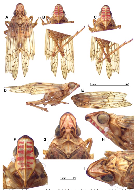 Hình 1: Sogana bachmana Constant & Pham, 2019. A, nhìn từ mặt lưng; B, nhìn từ mặt bụng; C nhìn từ phía trán; D nhìn từ mặt bên; E cánh trước bên phải; F, trán; G, đầu và ngực nhìn từ mặt lưng; H, đầu và ngực nhìn từ mặt bên; I, đầu và ngực nhìn từ mặt lung bên.