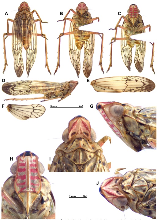 Hình 2: Sogana baviana Constant & Pham, 2019. A, nhìn từ mặt lưng; B, nhìn từ mặt bụng; C nhìn từ phía trán; D nhìn từ mặt bên; E cánh trước bên phải; F, cánh sau bên phải; G, đầu và ngực nhìn từ mặt bên; H, đầu và ngực nhìn từ trán; I, đầu và ngực nhìn từ mặt lưng; đầu và ngực nhìn từ mặt lung bên.