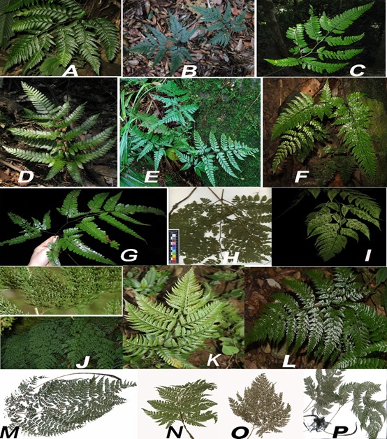 Hình 1: Hình thái của các loài trong 12 nhánh phát sinh của chi Arachniodes . A. “A. cf. xinpingensis” (nhánh Assamicae). B & L. A. webbia và A. gigantea (nhánh Gigantea). C, D & F. A. sp, A. simplicior và A. quangnamensis (nhánh Arachniodes). E. A. cf. carvifolia (nhánh Speciosa). G & H. A. subamoena và A. quadripinnata (nhánh Amoenae). I. A. globisora (nhánh Globisora). J. A. superba (nhánh Lithostegia). K. A. grossa (nhánh Grossa). M. A. festina (nhánh Festinae). N. A. mutica (nhánh Mutica). O. A. denticulata (nhánh Denticulata). P. A. foeniculacea (nhánh Conifollia). Nguồn ảnh: A, F, I, K & L: L. Zhang; B: M. Gibby; E: A. Priyadi; D–R: R. Knapp; J: H. He; O: https://plants.jstor.org (P): các ảnh còn lại là scan mẫu tại phòng mẫu CDBI.