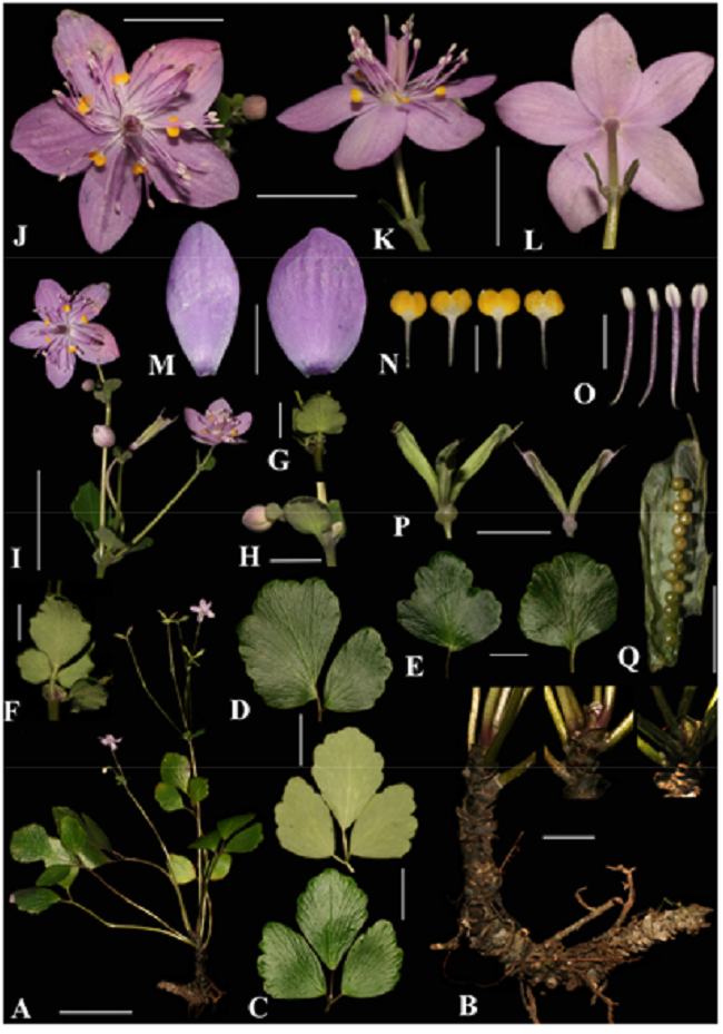 (A) Toàn cây mẫu. (B) Thân rễ có vẩy. (C) Mặt trên và mặt dưới lá kép 3 lá chét. (D) Mặt trên lá kép 2 lá chét. (E) Mặt trên lá đơn. (F, G) Lá trên thân. (B) Lá bắc. (I) Cụm hoa. (J) Hoa nhìn trực diện. (K) Hoa quan sát mặt bên. (L) Hoa nhìn phía sau. (M) Mặt trên của lá đài. (N) Cánh hoa. (O) Nhị hoa. (P) Quả nang. (Q) Hạt. Thước : A D 5 cm; B, C, D, E D 2 cm; F, G, H, M, Q D 0, 5 cm; I, J, K, L, P D 1 cm; N, O D 0, 2 cm.
