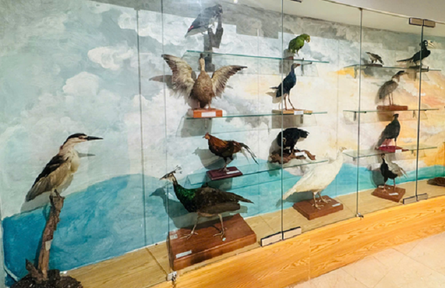 Khu trưng bày Các loài chim: Tại đây giới thiệu về sự đa dạng của thế giới loài chim, được chia thành ba nhóm chính gồm chim chạy (gà rừng, công Ấn Độ, công trắng), chim bơi (vạc) và chim bay (khướu, vẹt).