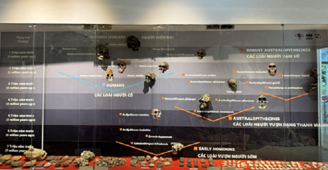 Khu trưng bày Nhân chủng học: Lịch sử tiến hóa loài người đã được các nhà khoa học nghiên cứu dựa trên các hóa thạch sọ người. Từ những vượn người sớm biết đứng thẳng, các loài Australopithecus mở đường cho chi Homo – nơi con người cổ chế tác công cụ, kiểm soát lửa và rời châu Phi. Qua Homo erectus đến H. heidelbergensis, phân nhánh thành Neanderthals. Denisovans và cuối cùng là Homo sapiens. Người hiện đại mang theo trí tuệ, ký ức và văn hóa lan khắp địa cầu. Trong đó gồm các nhóm chính: Các loài vượn người sớm (7-4 triệu năm trước); các loài người vượn dang thanh mảnh (4-2 triệu năm trước); các loài người vạm vỡ (2,7 – 1,2 triệu năm trước); các loài người cổ (2,4 triệu năm tước) và người hiện đại. Lịch sử tiến hóa loài người đã được các nhà khoa học nghiên cứu dựa trên các hóa thạch sọ người. Những mẫu vật được các nhà khoa học Bảo tàng Thiên nhiên Việt Nam sử dụng công nghệ in 3D để in. Đây là mô hình hiện đại và đang được các bảo tàng thế giới sử dụng và rất có ý nghĩa trong việc giáo dục các em học sinh hiểu về lịch sử tiến hóa loài người. Đi cùng không gian này là các nhóm sưu tập di vật khảo cổ học thời tiền sử Việt Nam.
