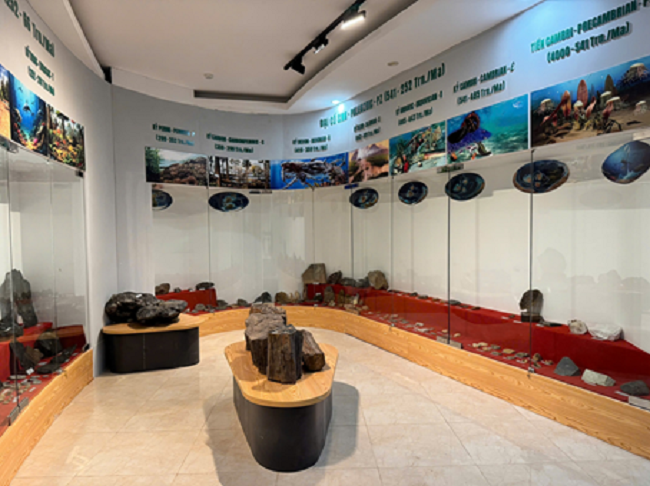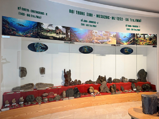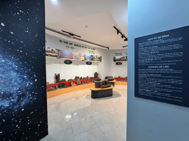 Khu trưng bày Lịch sử sự sống trên Trái đất: Không gian trưng bày gồm 13 ô với các mẫu đã và hóa thạch tượng trưng cho 4 thời kỳ phát triển địa chất trên Trái đất gồm: Thời kỳ Tiền Cam bri (4,5 – 541 triệu năm); Thời kỳ đại Cổ sinh (541-252 triệu năm); Thời kỳ đại Trung sinh (252 – 66 triệu năm); Thời kỳ đại Tân sinh (66 triệu năm – ngày nay). Mỗi một Thời kỳ có một sự phát triển riêng và được thể hiện qua các kỷ khác nhau.
