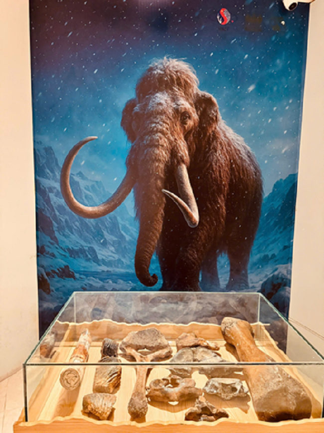 Một điểm nhấn nữa của Không gian trưng bày kỷ Đệ tứ là bộ xương hóa thạch khá đầy đủ (bao gồm xương đùi, xương sống, xương cụt, xương sườn, răng và ngà) của Voi Ma Mút, được phát hiện ở Biển Bắc. Voi ma mút là biểu tượng của kỷ băng hà, với lớp lông dày và sức sống mạnh mẽ, gợi cho chúng ta hình dung rõ rệt về một thời kỳ băng giá xa xưa.