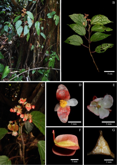 Ảnh 2. Begonia saolaensis Y.M. Shui, T.A. Le & C.T. Vu sp. nov. A. Dạng sống; B. Cành mang hoa; C. Cụm hoa; D. Cụm hoa đực; E. Cụm hoa cái; F. Chùm quả; G. Quả cắt ngang. Người chụp: Lê Tuấn Anh
