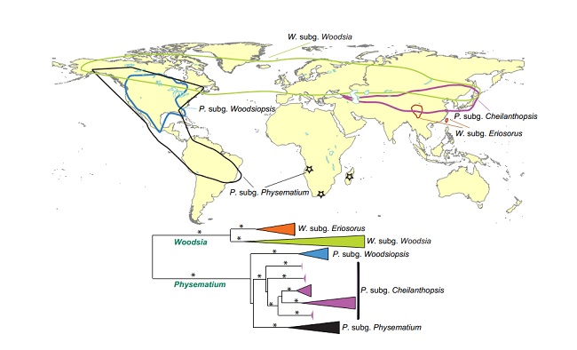 Hình 1. Bản đồ phân bố của họ Woodsiaceae và cây phát sinh đơn giản hóa
