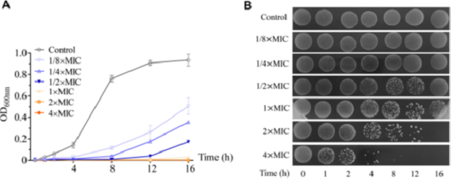 Biểu đồ thể hiện sự ức chế phát triển tế bào tụ cầu khuẩn bởi dịch chiết tổ yến: (A) độ đậm đặc của tế bào tụ cầu khuẩn đo ở bước sóng 600 nm (OD600nm); (B) Ảnh chụp sự phát triển của tụ cầu khuẩn trên đĩa petri với các nồng độ dịch chiết tổ yến khác nhau. (MIC: nồng độ ức chế tối thiểu)