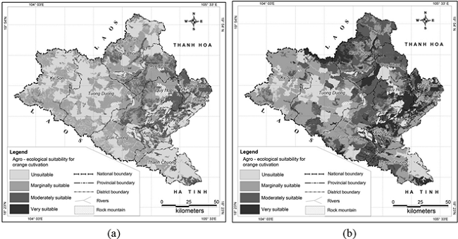 Bản đồ đánh giá thích nghi đất đai sinh thái cho trồng cam (a) sử dụng ALES; (b) sử dụng LSE.