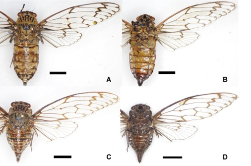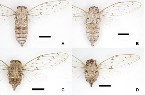 Hình 3. Semia pallida: A–B, mẫu chuẩn con đực: A, nhìn từ mặt lưng. B, nhìn từ mặt bụng. C–D, con cái: C, nhìn từ mặt lưng. D, nhìn từ mặt bụng. Thước đo =10 mm.