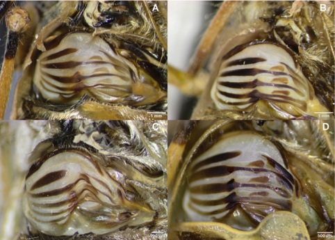 Hình 5. Cơ quan phát thanh con đực: A, Semia magna; B, Semia spiritus; C, Semia pallida; D. Semia albusequi