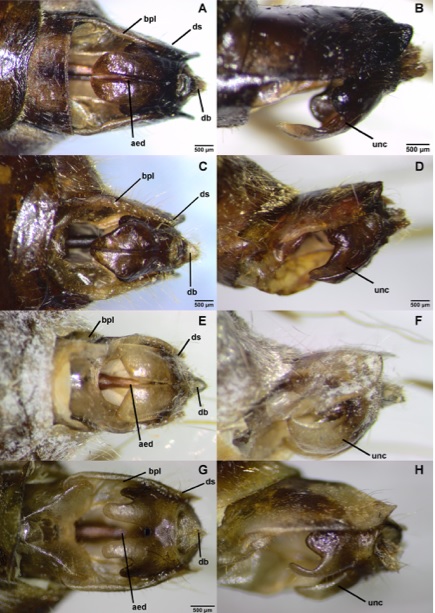 Hình 6. Bộ phận sinh dục con đực: A–B, Semia magna: A, nhìn từ mặt bụng. B, nhìn từ mặt bên. C–D, Semia spiritus: C, nhìn từ mặt bụng. D, nhìn từ mặt bên. E–F, Semia pallida: E, nhìn từ mặt bụng. F, nhìn từ mặt bên. G–H, Semia albusequi: G, nhìn từ mặt bụng. H, nhìn từ mặt bên. aed: aedeagus; bpl: basal lobe of pygofer; db: dorsal beak; ds: distal shoulder; unc: uncus