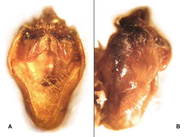 Hình 2: Bộ phận sinh dục con đực loài Megapomponia bourgoini, A. pygofer, nhìn từ mặt bụng; B. pygofer, nhìn từ mặt bên.