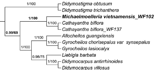 Hình 1. Mối quan hệ của Michaelmoelleria vietnamensis với các taxa trong tông Didymocarpeae dựa trên dữ liệu phân tử của vùng gen nhân (ITS) và vùng gen lục lạp (trnL-F)