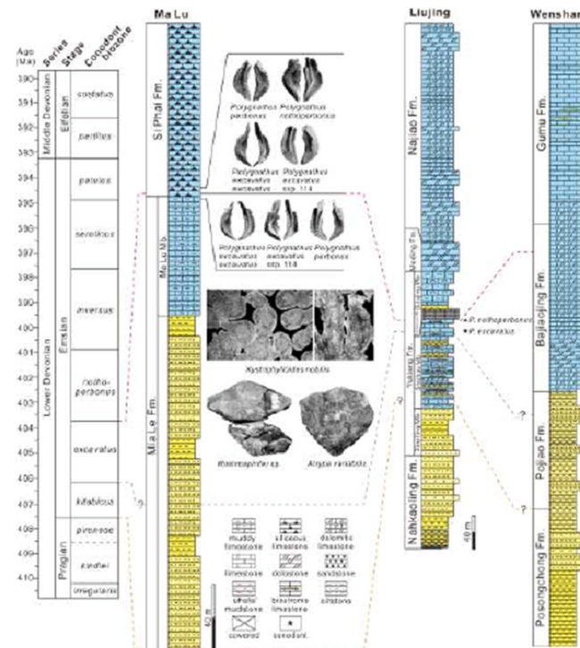 Cột địa tầng thể hiện sự liên quan giữa mặt cắt chuẩn của Emsian sớm phía Bắc Việt Nam và Nam Trung Hoa