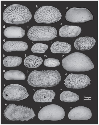 Fig. 4. Ảnh quét quang điện tử một số loài đặc trưng của các sinh tướng A, B, C, và D. Tất cả các mẫu vật đều được chụp ở mảnh bên trái. Ngoại trừ (q) A-1, tất cả các mẫu vật đều là các mẫu trưởng thành. (a) Aurila spiniferaSchornikov and Tsareva, 1995, St. 9, GCM-RS 521; (b) Aurila cymba (Brady, 1869), 1968, St. 1, GCM-RS 522; (c) Amphileberis nipponica (Yajima, 1978), St. 8, GCM-RS 523; (d) Ambtonia tsukuiHu and Tao, 2008, St. 8, GCM-RS 524; (e) Bicornucythere bisanensis (Okubo, 1975), St. 32, GCM-RS 525; (f) Bythoceratina cf. hanaiiIshizaki, 1968, St. 9, GCM-RS 526; (g) Cytheromorpha acupunctata (Brady, 1880), St. 32, GCM-RS 527; (h) Cytheropteron miurenseHanai, 1957c, St. 9, GCM-RS 528; (i) Callistocythere undulatifacialisHanai, 1957a, St. 4, GCM-RS 529; (j) L. tosaensisIshizaki, 1968, St. 32, GCM-RS 530; (k) Loxoconcha uranouchiensisIshizaki, 1968, St. 29, GCM-RS 531; (l) Loxoconcha vivaIshizaki, 1968, St. 8, GCM-RS 532; (m) Nipponocythere bicarinata (Brady, 1880), St. 7, GCM-RS 533; (n) Neonesidea oligodentata (Kajiyama, 1913), St. 9, GCM-RS 534; (o) Parakrithella pseudadonta (Hanai, 1959a), St. 1, GCM-RS 535; (p) Pistocythereis bradyformis (Ishizaki, 1968), St. 7, GCM-RS 536; (q) Pistocythereis bradyi (Ishizaki, 1968), St. 29, GCM-RS 537; (r) Pseudoaurila japonica (Ishizaki, 1968), St. 29, GCM-RS 538; (s) Schizocythere kishinouyei (Kajiyama, 1913), St. 10, GCM-RS 539; (t) Spinileberis quadriaculeata (Brady, 1880), St. 32, GCM-RS 540; (u) Trachyleberis scabrocuneata (Brady, 1880), St. 32, GCM-RS 541; (v) Xestoleberis hanaiiIshizaki, 1968, St. 1, GCM-RS 542; (w) Xestoleberis ryukyuensisSato and Kamiya, 2007, St. 1, GCM-RS 543.