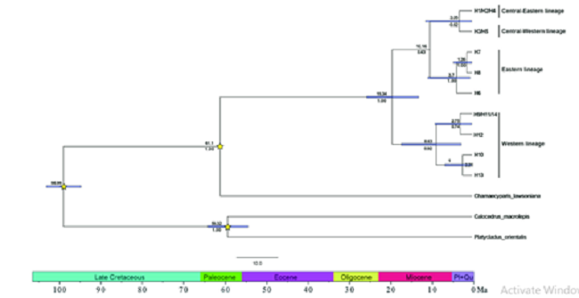 Hình 2. Ước lượng thời gian phân chia của các dòng chính của loài Pơ mu dựa trên phân tích BEAST từ dữ liệu gen lục lạp