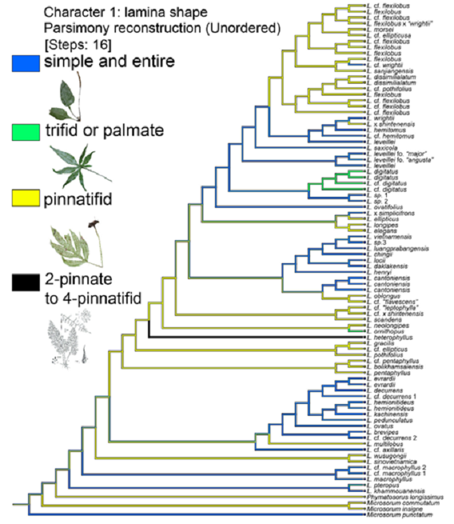 Hình 2. Tái dựng hình thái phiến lá của chi Leptochilus và các chi liên quan được tối ưu hóa trên cây phát sinh