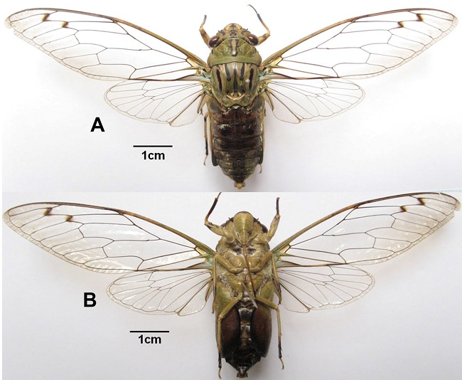 Hình 1: Hình ảnh con đực loài ve sầu Orientopsaltria dongnaiensis Pham et. al., 2019: A, nhìn từ mặt lưng. B, nhìn từ mặt bụng