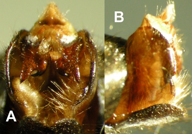 Hình 2: Cấu tạo bộ phận sinh dục con đực loài ve sầu Orientopsaltria dongnaiensis Pham et. al., 2019: A, nhìn từ mặt bụng bên. B, nhìn từ mặt bên.
