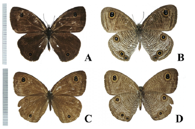 Hình 1. Ypthima thao Monastyrskii & Lang, 2022. A – B: Mẫu holotype, con đực, Đồng Văn, Hà Giang, Việt Nam; C – D: mẫu Paratype, con cái, Vườn quốc gia Tam Đảo, Vĩnh Phúc, Việt Nam.